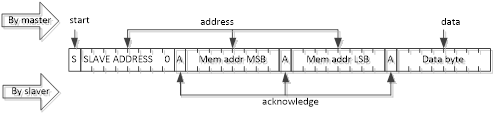 如图中所示,写时序是以主控制器发送start信号为起始条件,紧接最低位为0从器件地址表示写操作,当收到ACK信号后会将从器件的存储地址(图中地址为2字节,具体多少字节视情况而定)发送到总线,最后发送正式的正文。