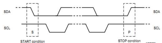 结束传输的回调函数__IIC_GenerateEnd主要用于停止当前正在进行的传输,特别是在发生超时传输时,用于停止本次发送或接收,实际上,该函数调用了产生停止时序的函数,使IIC主器件停止本帧数据的传输。启动和停止时序如图 4‑4所示。